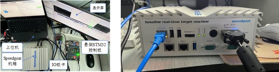 多模态可控悬架试验平台是基于实时仿真技术的先进测试系统,由MTS试验台、智能悬架执行器、传感器网络和Speedgoat实时目标机共同构成。平台通过MTS系统模拟随机路面激励,精准复现多种实际行驶工况;智能悬架执行器(包括电磁作动器与磁流变阻尼器)安装在簧载与非簧载质量之间,通过传感器实时采集系统动态响应,Speedgoat与上位机建立通信,既接收控制指令又下发控制信号至智能悬架执行器,调节其输出的主动力和阻尼力,从而实现对悬架振动的高效控制。该平台支持悬架多种工作模式的实时切换与自适应控制,为多模式可控悬架系统的性能评估和算法验证提供了高精度、全工况的测试环境。