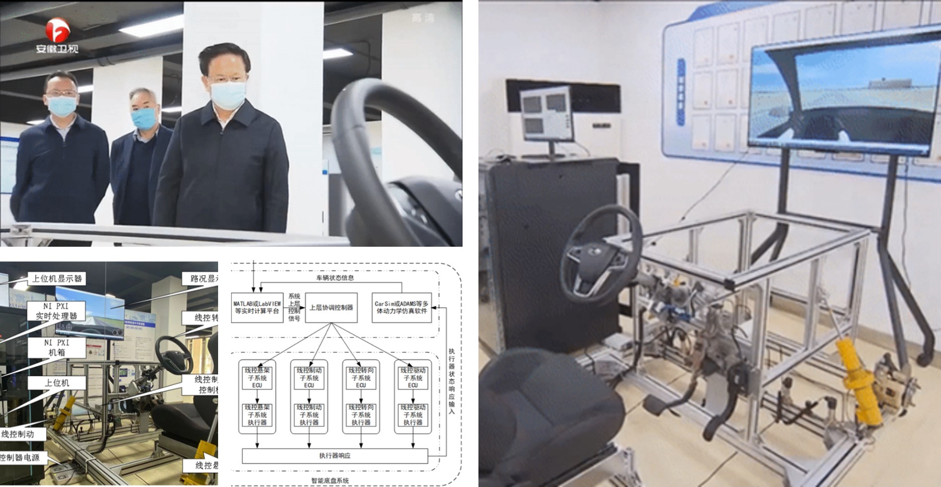 团队自主开发的智能网联汽车线控底盘全硬件在环实时操控-互联系统平台,是一个集成了线控悬架、线控制动与线控转向三大核心子系统的全硬件在环一体化研发平台。平台基于原型化、模块化及架构分层的设计理念,构建了以上位机、NI PXI目标机、I/O板卡及STM32控制板等为核心的硬件环境,并通过NI Veristand与Carsim的深度集成,实现了车辆动力学模型与底层硬件的实时数据交互。平台具备两种核心工作模式:其一,可通过Carsim设定各种行驶工况,对底盘系统进行传感器数据采集与闭环测试;其二,可直接在实体底盘上进行转向或制动操作,并由Carsim实时模拟并呈现车辆动态响应。两种模式均可在人机交互界面上进行信号观测与数据存储,使其能够同时完成单一车辆的实时精确操控与多车互联测试,全面覆盖从控制策略开发、整车电气架构设计到车路协同理论验证的研发需求,为智能网联汽车线控底盘技术提供了高效的研发与验证环境。