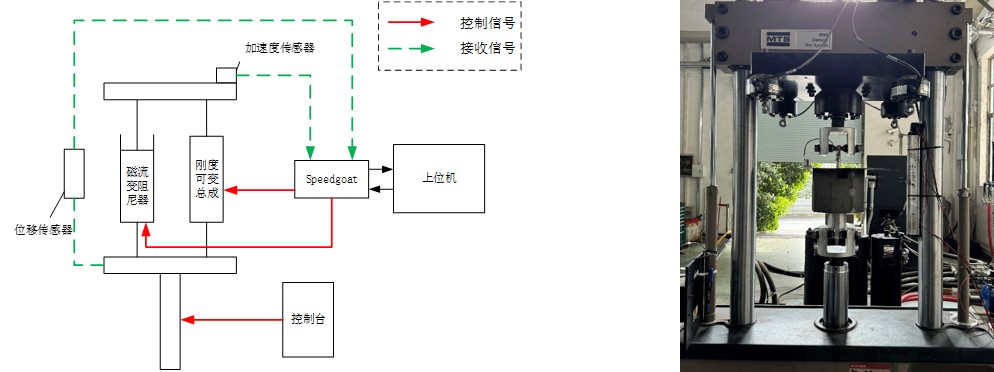 多模态可控悬架试验平台是基于实时仿真技术的先进测试系统,由MTS试验台、智能悬架执行器、传感器网络和Speedgoat实时目标机共同构成。平台通过MTS系统模拟随机路面激励,精准复现多种实际行驶工况;智能悬架执行器(包括电磁作动器与磁流变阻尼器)安装在簧载与非簧载质量之间,通过传感器实时采集系统动态响应,Speedgoat与上位机建立通信,既接收控制指令又下发控制信号至智能悬架执行器,调节其输出的主动力和阻尼力,从而实现对悬架振动的高效控制。该平台支持悬架多种工作模式的实时切换与自适应控制,为多模式可控悬架系统的性能评估和算法验证提供了高精度、全工况的测试环境。